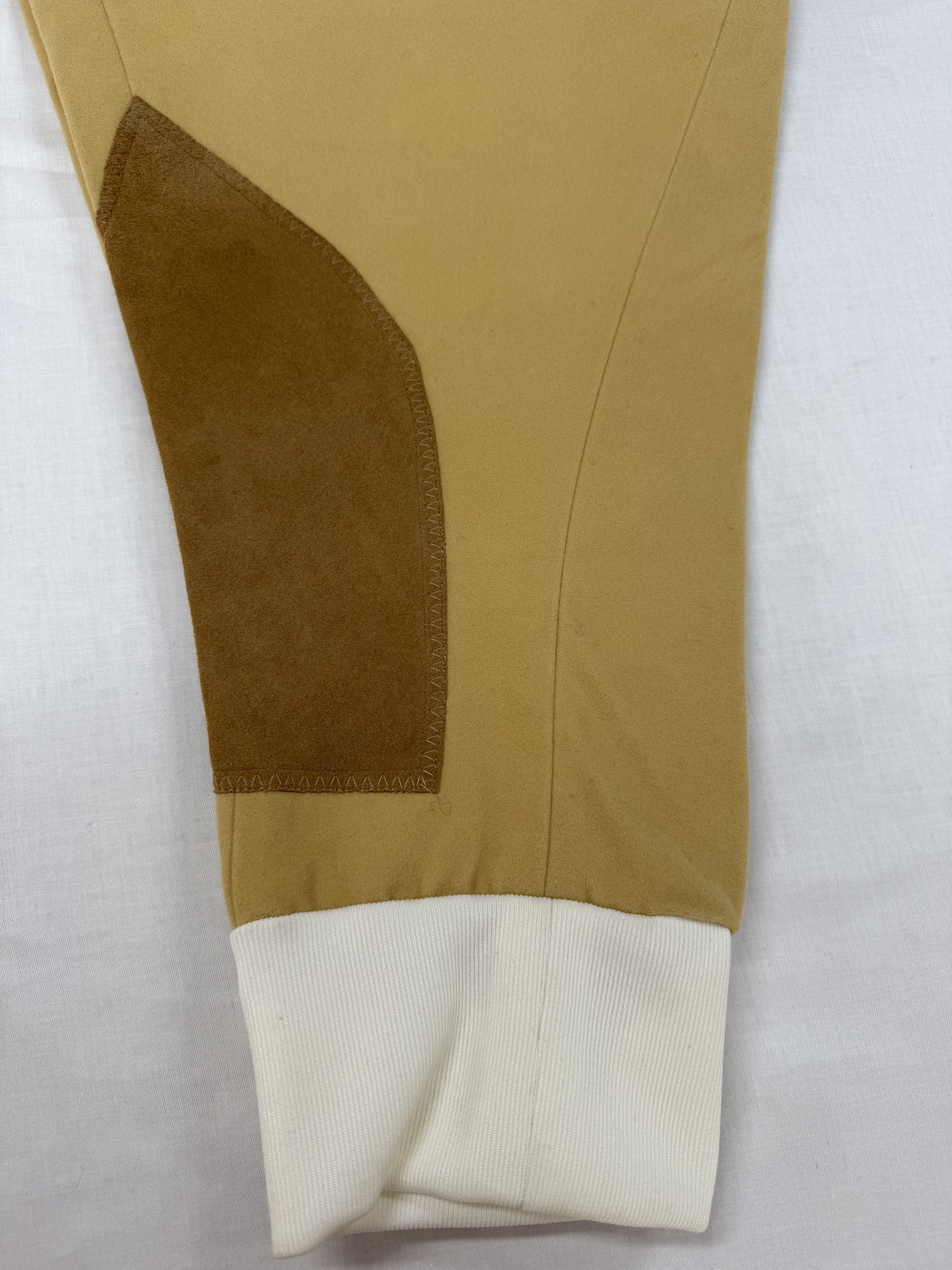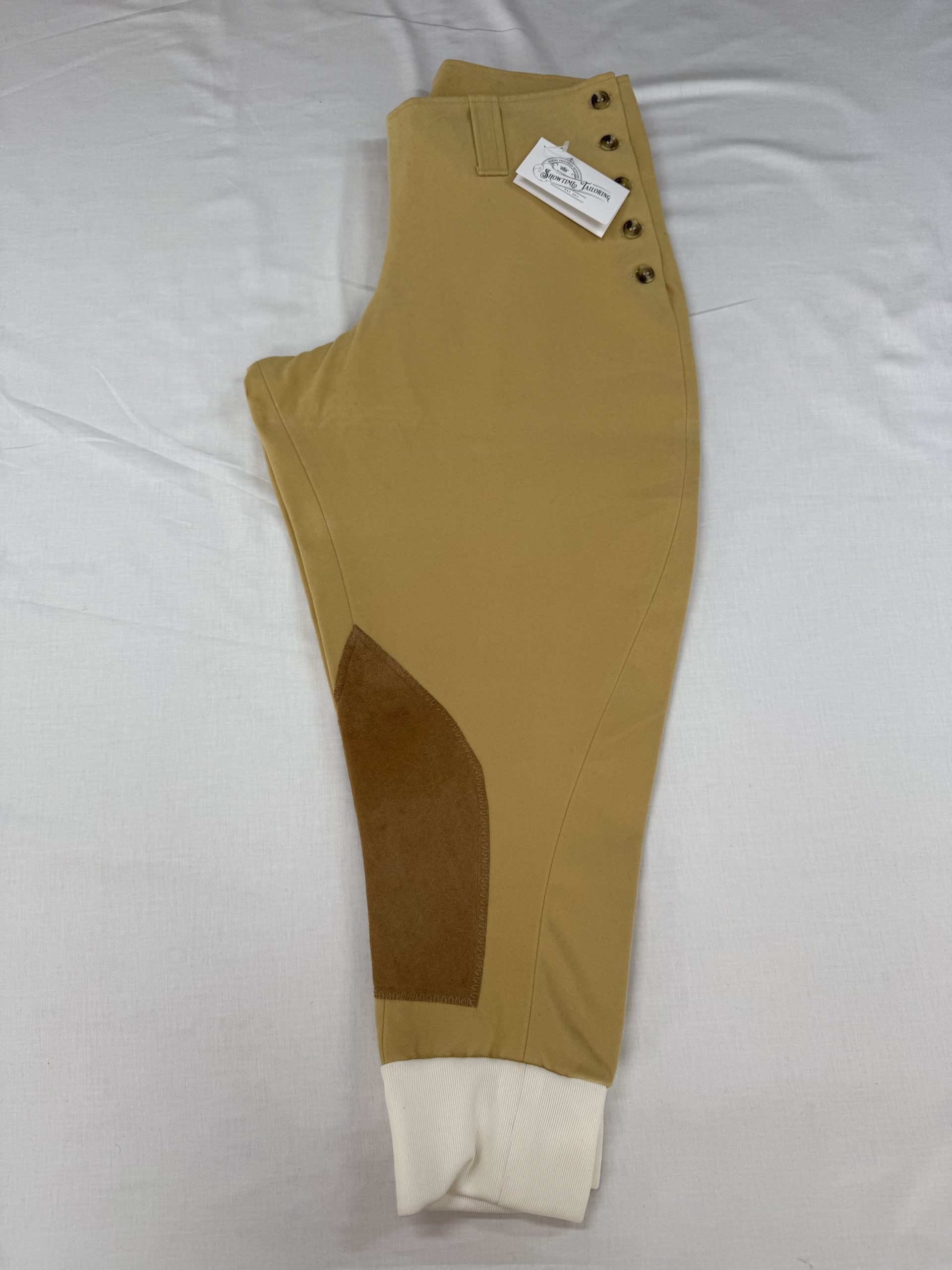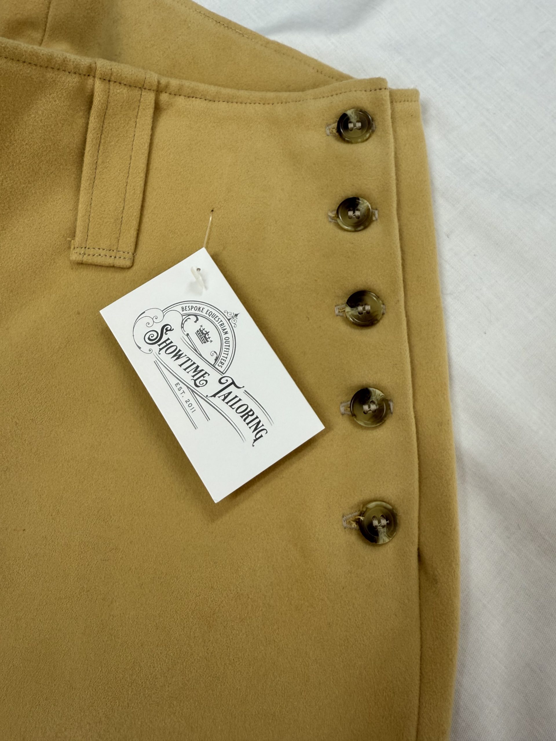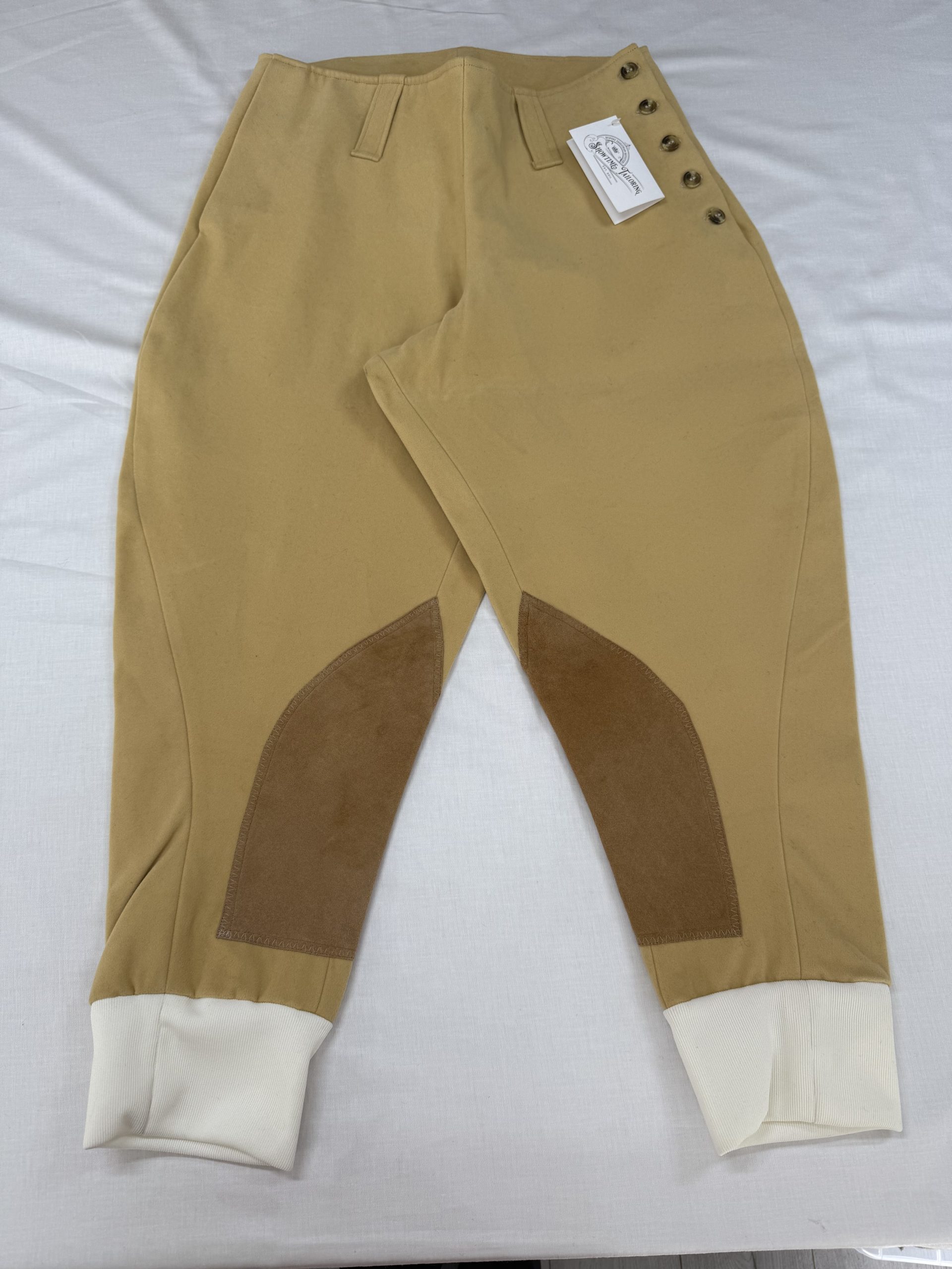 High waisted and belt loops included. Knee patches can be made in either our machine washable faux suede or our gorgeous real leather. Our breeches are available in cotton moleskin (machine washable at 30′), Keepers tweed and Cavalry Twill Wool (special order fabric).